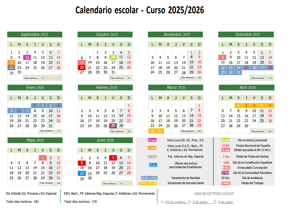 Se muestra el calendario escolar provincial. De los días correspondientes a nuestra localidad solo se ha confirmado el lunes 20 de octubre. Previsiblemente los dos restantes serían el vienes de feria y el lunes de resaca, pero hasta confirmación de la autoridad competente no figurará actualizado en el calendario.
